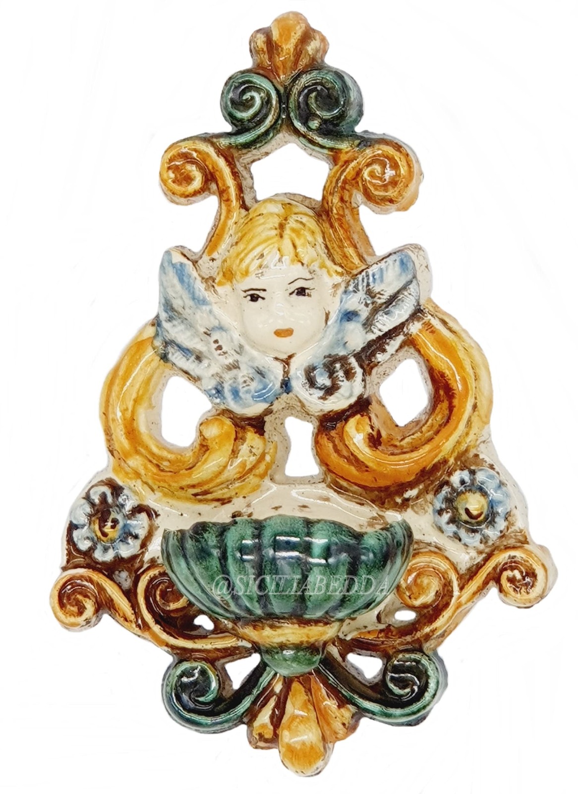 Acquasantiera traforata h 11 angioletto verde/arancio