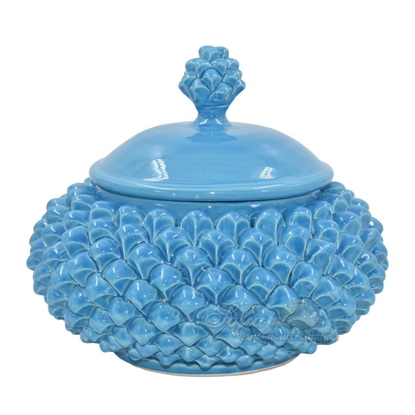 La tradizione popolare Siciliana ritiene che sia utile regalare delle pigne da appendere sopra la porta di casa come augurio di salute e buona fortuna alle famiglia che vi abita. Ma la Pigna la troviamo anche su balconi e cancelli di ingresso di antiche ville e giardini nobiliari, cimiteri monumentali, facciate di chiese e conventi, fino a popolare i troni di re e pontefici come materializzazione dell’anima, il ponte che unisce il terreno al divino. Questi significati si materializzano tra le mani di abili artigiani della ceramica che realizzano pigne di grandi e piccole dimensioni. Oggi le Pigne Artistiche, usate come bomboniere, regalo di nozze, complementi di arredo per interni ed esterni o come come base lampada, restano un modo esclusivo di esprimere un profondo augurio di benessere.