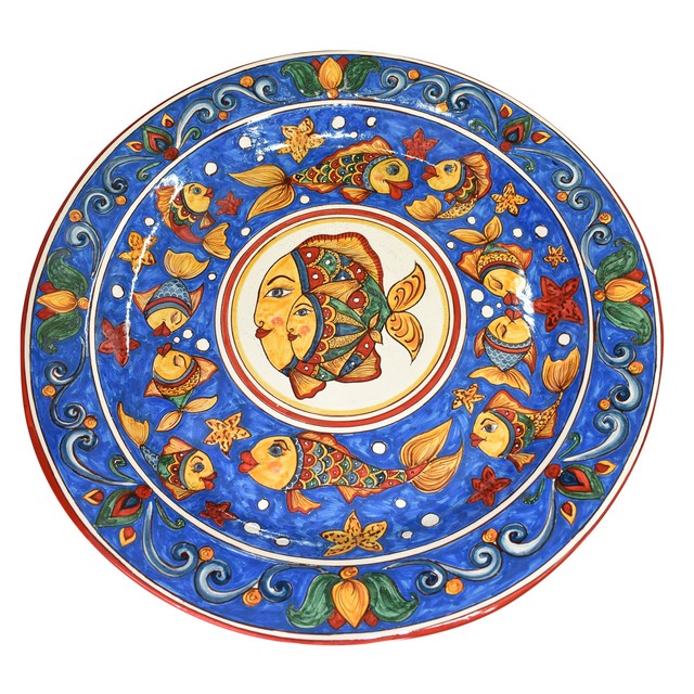 Piatto falda Ø 60 decoro pesci c/fondo blu bordo rosso