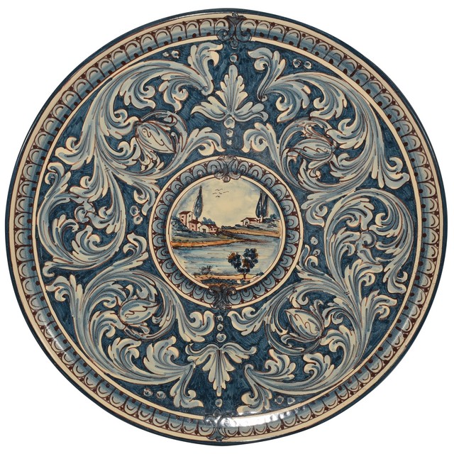 Piatto Ø 43 c/paesaggio ornato mono blu