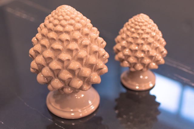 La tradizione popolare Siciliana ritiene che sia utile regalare delle pigne da appendere sopra la porta di casa come augurio di salute e buona fortuna alle famiglia che vi abita. Ma la Pigna la troviamo anche su balconi e cancelli di ingresso di antiche ville e giardini nobiliari, cimiteri monumentali, facciate di chiese e conventi, fino a popolare i troni di re e pontefici come materializzazione dell’anima, il ponte che unisce il terreno al divino. Questi significati si materializzano tra le mani di abili artigiani della ceramica che realizzano pigne di grandi e piccole dimensioni. Oggi le Pigne Artistiche, usate come bomboniere, regalo di nozze, complementi di arredo per interni ed esterni o come come base lampada, restano un modo esclusivo di esprimere un profondo augurio di benessere.